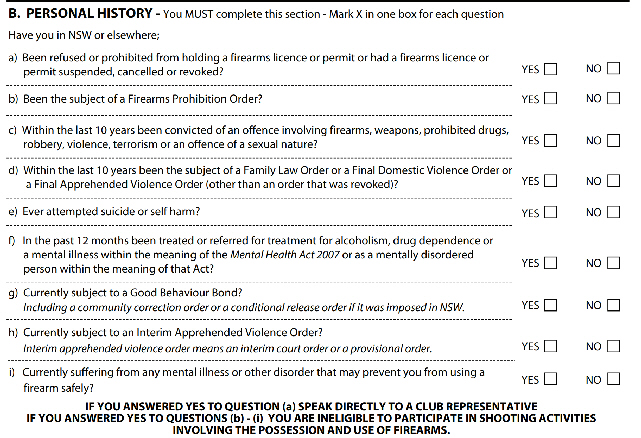 You will be required to complete a Police P650 form which will ask a number of questions. Relevant questions screenshot below. Please note that if you believe you will answer YES to ANY of these questions, please contact us at Waggassaapistolclub@gmail.com prior to attending as we will have to provide you some information, confidentially, on your application.